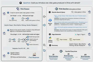 WebPlanner通过DAG的拓扑关系识别无依赖的并行子任务(如“嫦娥六号的通信挑战”与“阿波罗11号的着陆技术”可同时检索),并将这些子任务分配给多个WebSearcher实例并行执行,大幅提升信息获取效率。