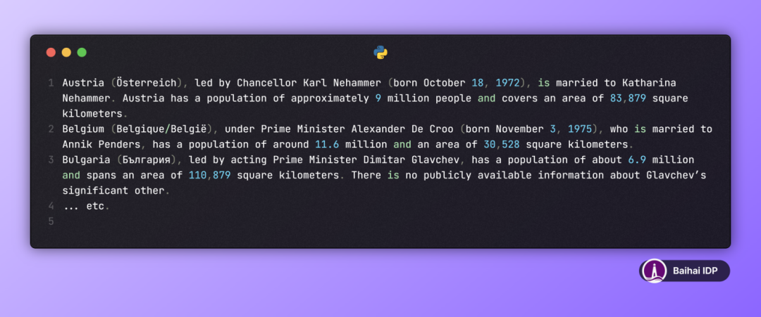 我将要求 LLM 将这段普通文本转换成结构化数据,其中每个国家都是一条记录,每条记录包含国家名称、领导人姓名、领导人出生日期、领导人性别、人口数量和领土面积等键 / 值对。