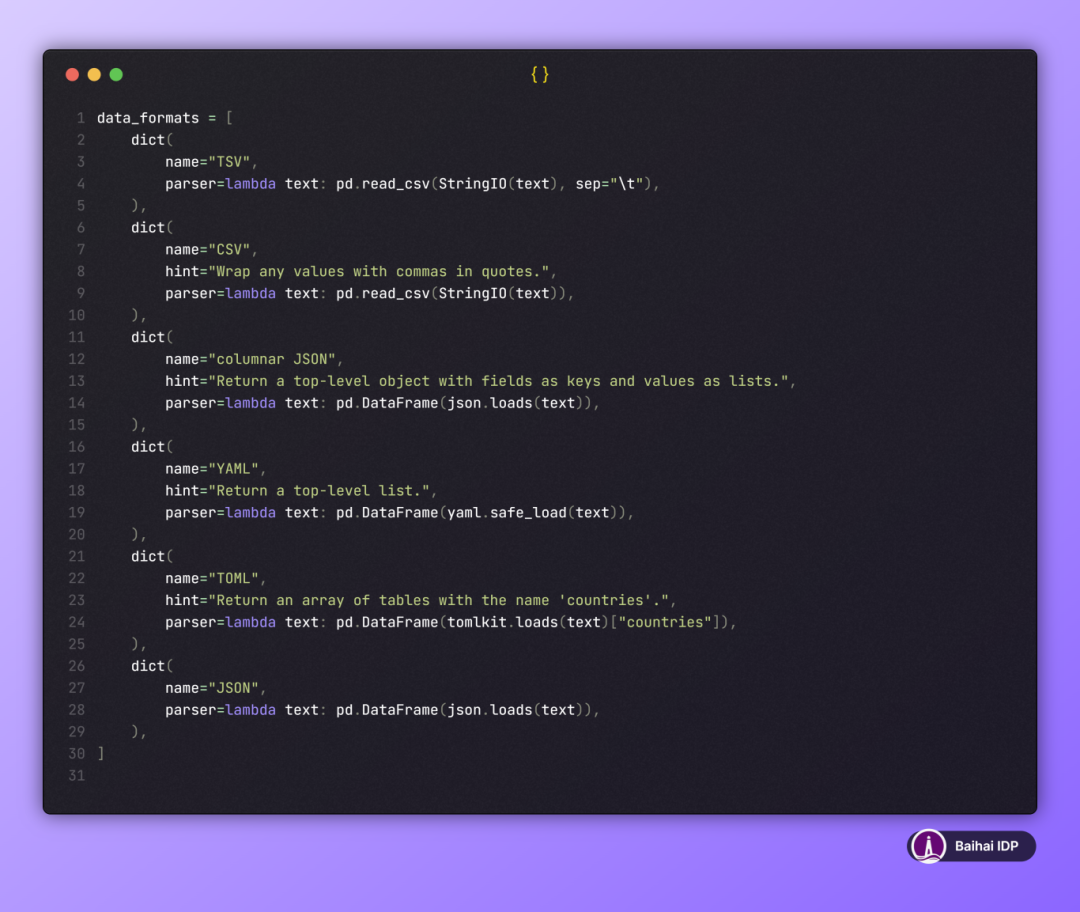 感兴趣的朋友,可以在这个 gist [1] 中查看完整的代码。对于不太感兴趣的朋友,这里展示了我如何为每种格式定义 name、可选的 hint 以及 parser(这里将所有数据解析成 Pandas DataFrame):