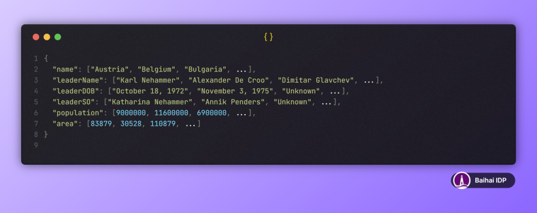 可能有些人还不清楚 Columnar JSON 是什么样的,下面就是前文提到的国家数据所对应的 Columnar JSON 格式: