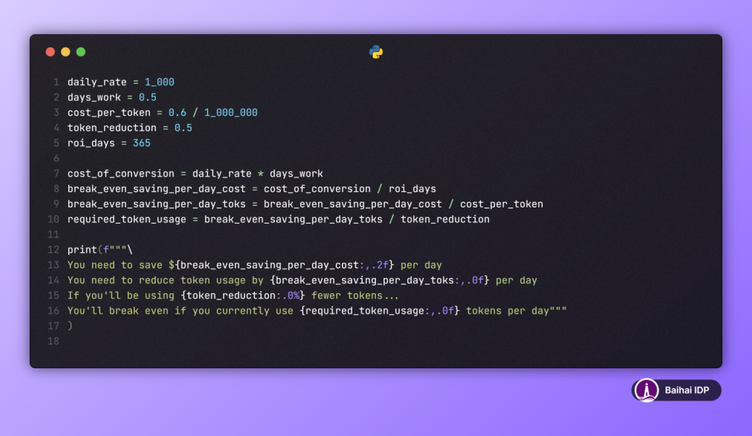 你的时间成本是每天 1000 美元 将现有系统从 JSON 转换为 TSV 需要半天时间 输出 token 的费用是每百万 0.60 美元 使用 TSV 可以减少 50% 的 token 使用量 你希望一年内收回投资 我们可以用一个小 Python 脚本来计算这些数值: