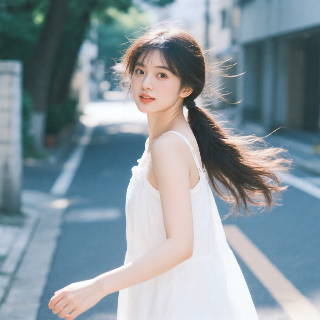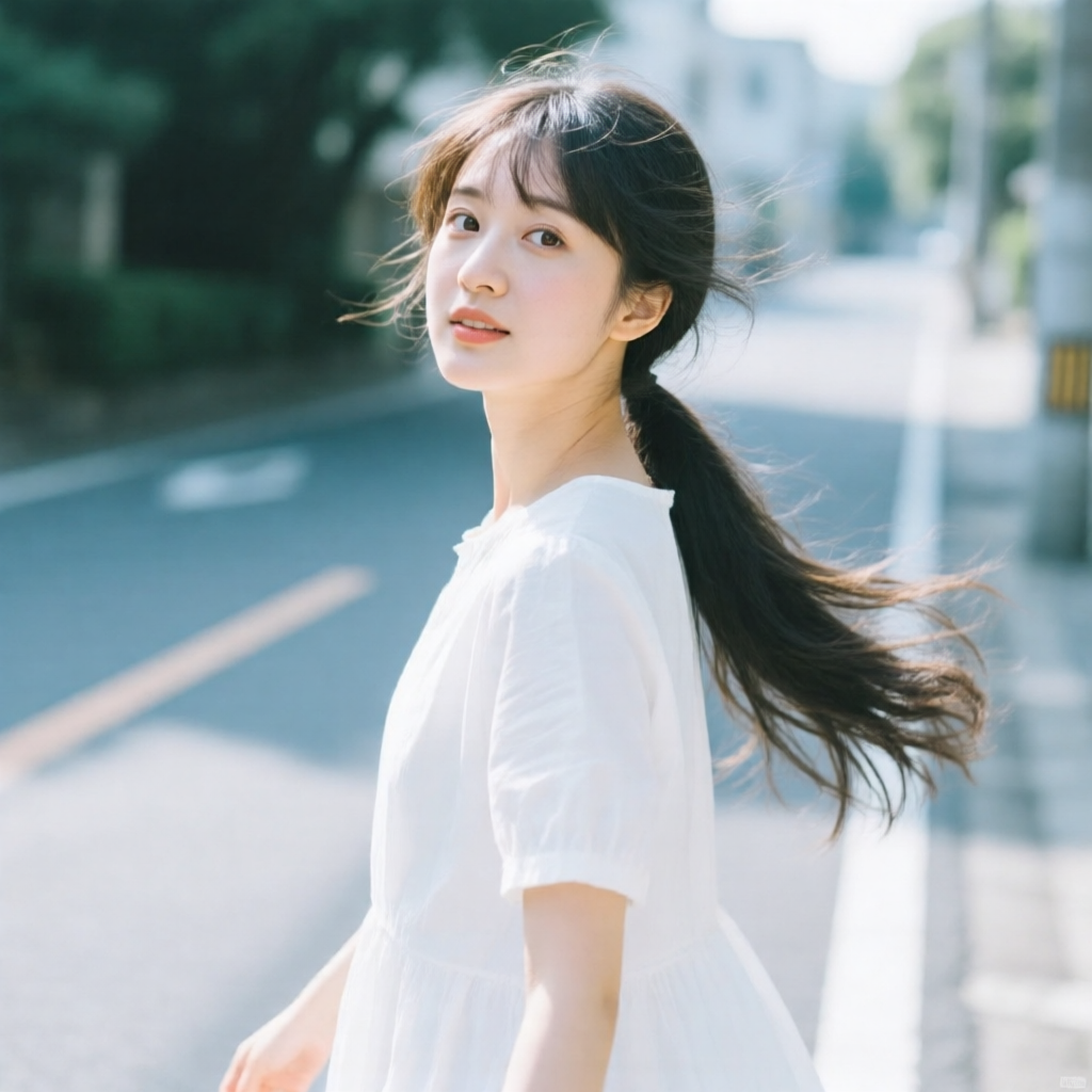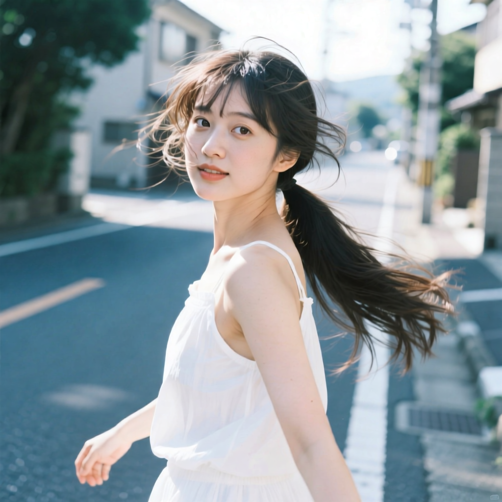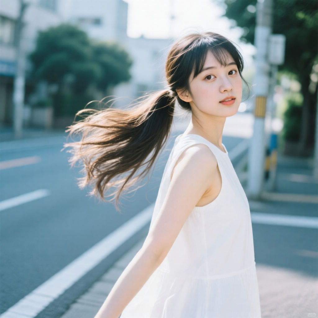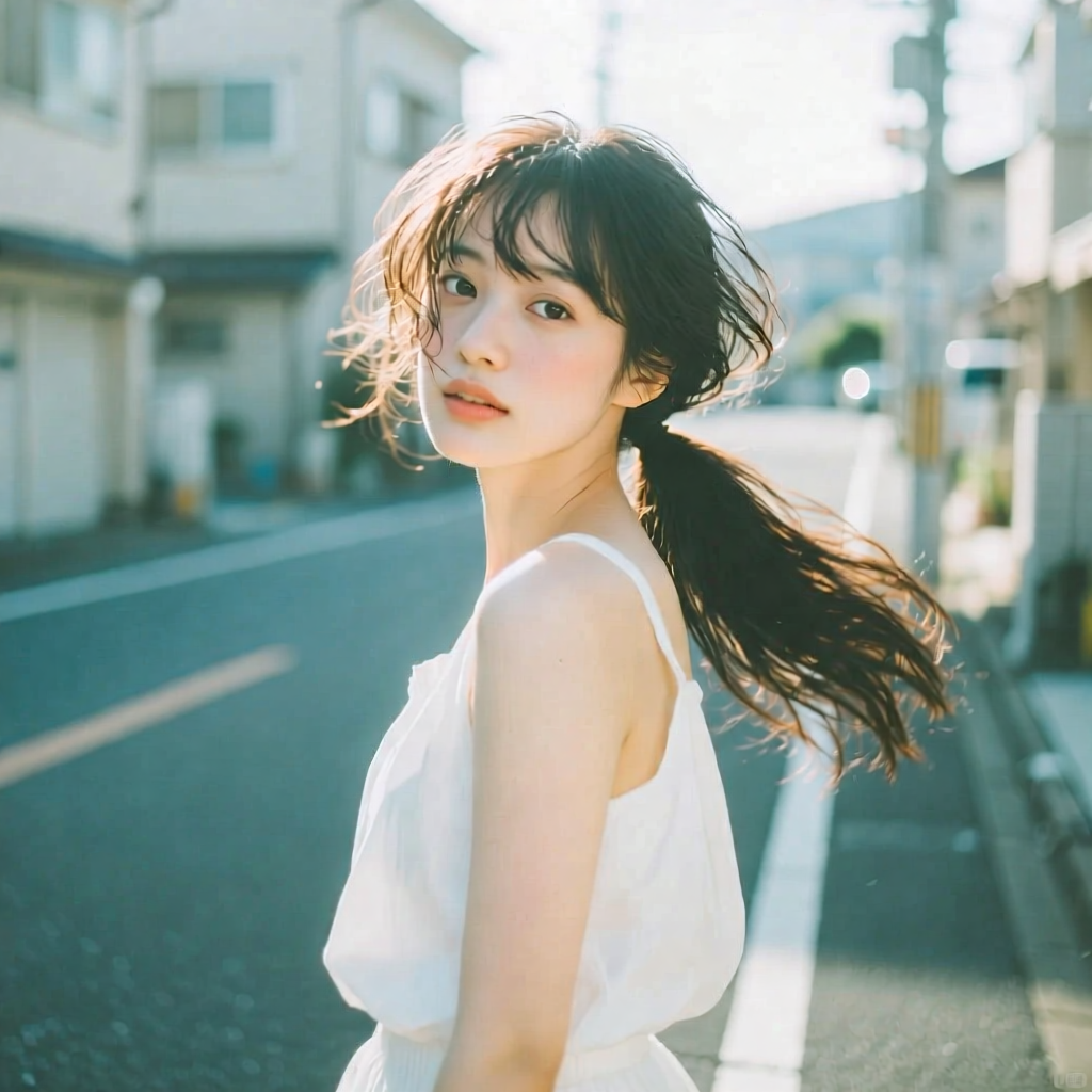 提示词:户外摄影,美女写真,夏天白色穿搭,长马尾,自然,微风,头发凌乱美,灵动转身,街道的路边,松弛感,近景,水平角度,眼睛特写,广角镜头,曝光过度,层次感,柔和侧光,光影对比,柔焦,胶片颗粒感,日系清新风,冷调,镜头美学,电影质感,高级感,大师级作品,