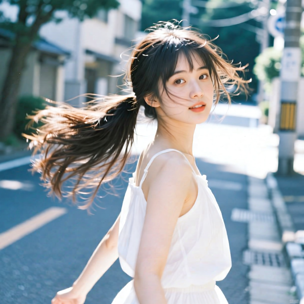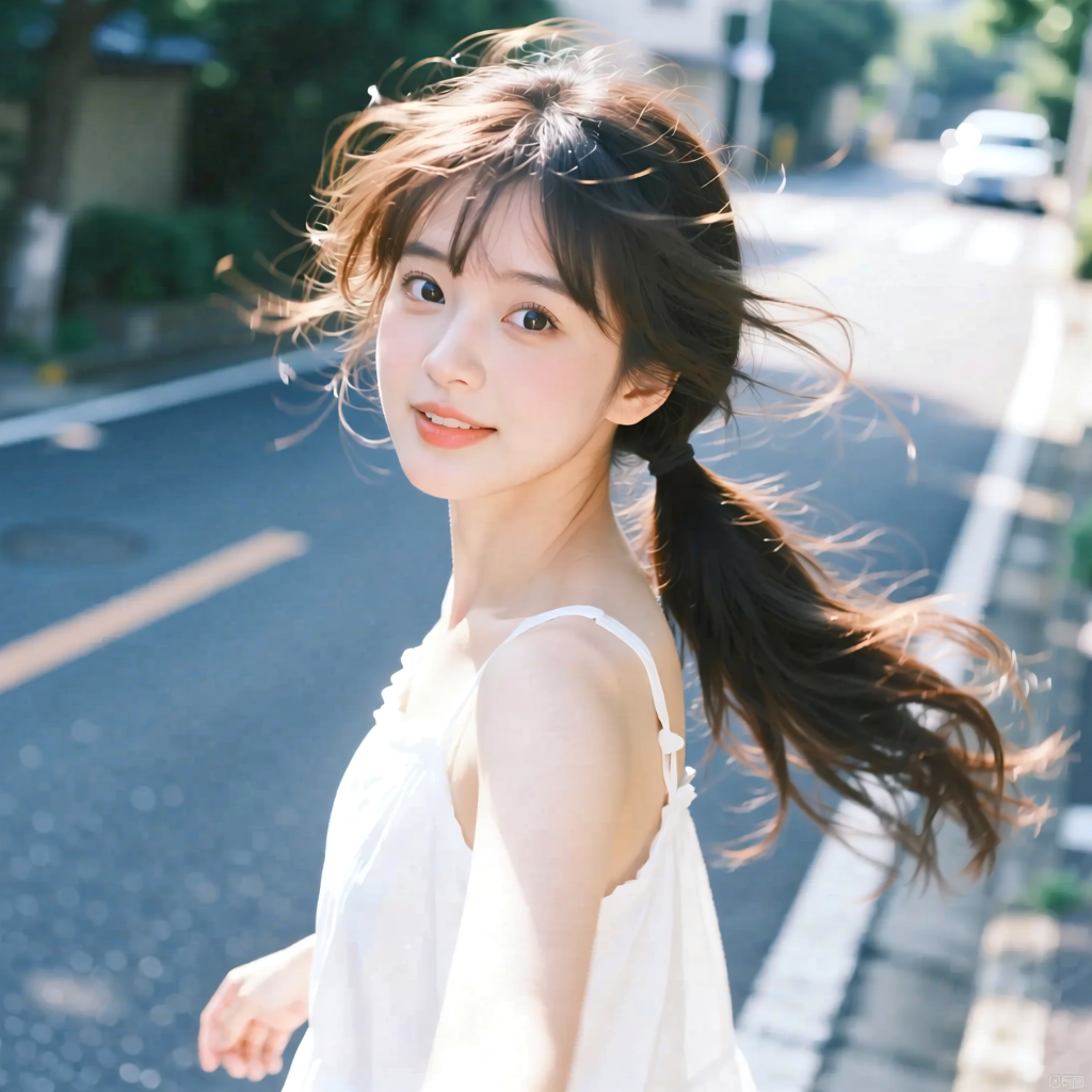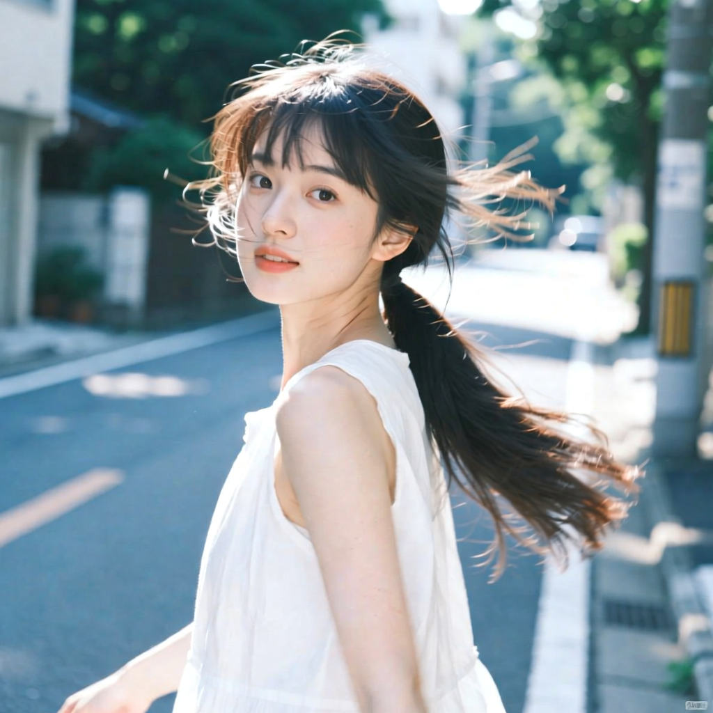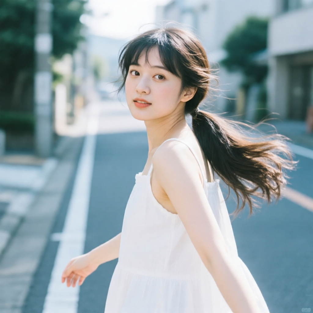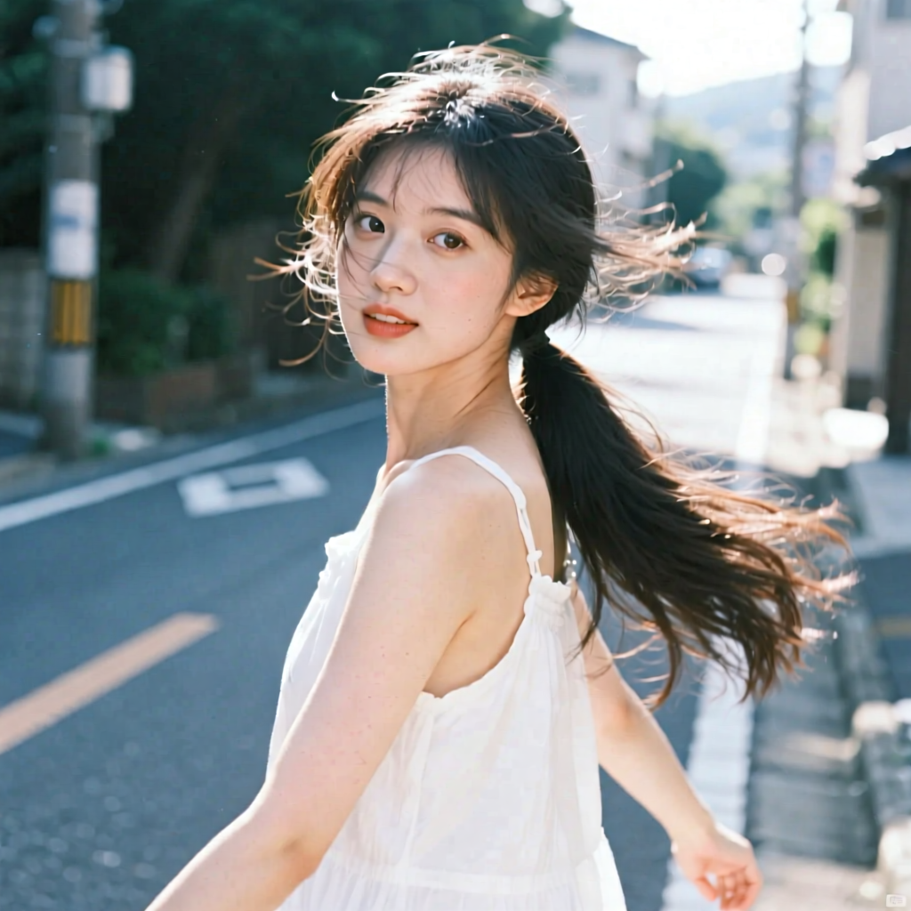 提示词:户外摄影,美女写真,夏天白色穿搭,长马尾,自然,微风,头发凌乱美,灵动转身,街道的路边,松弛感,近景,水平角度,眼睛特写,广角镜头,曝光过度,层次感,柔和侧光,光影对比,柔焦,胶片颗粒感,日系清新风,冷调,镜头美学,电影质感,高级感,大师级作品,