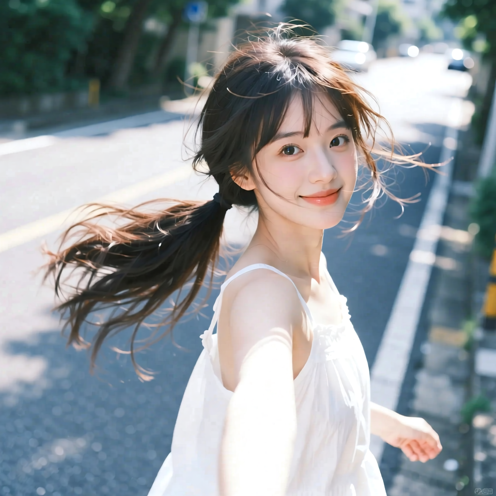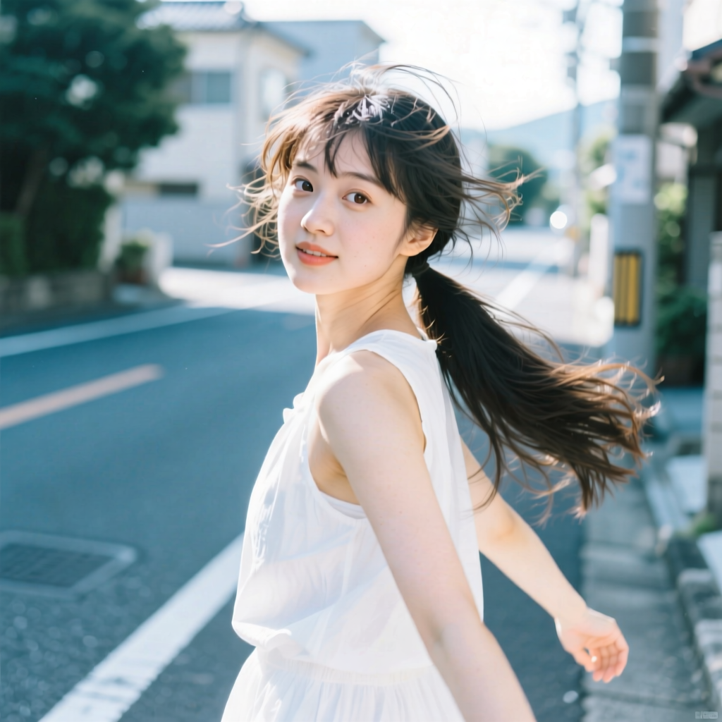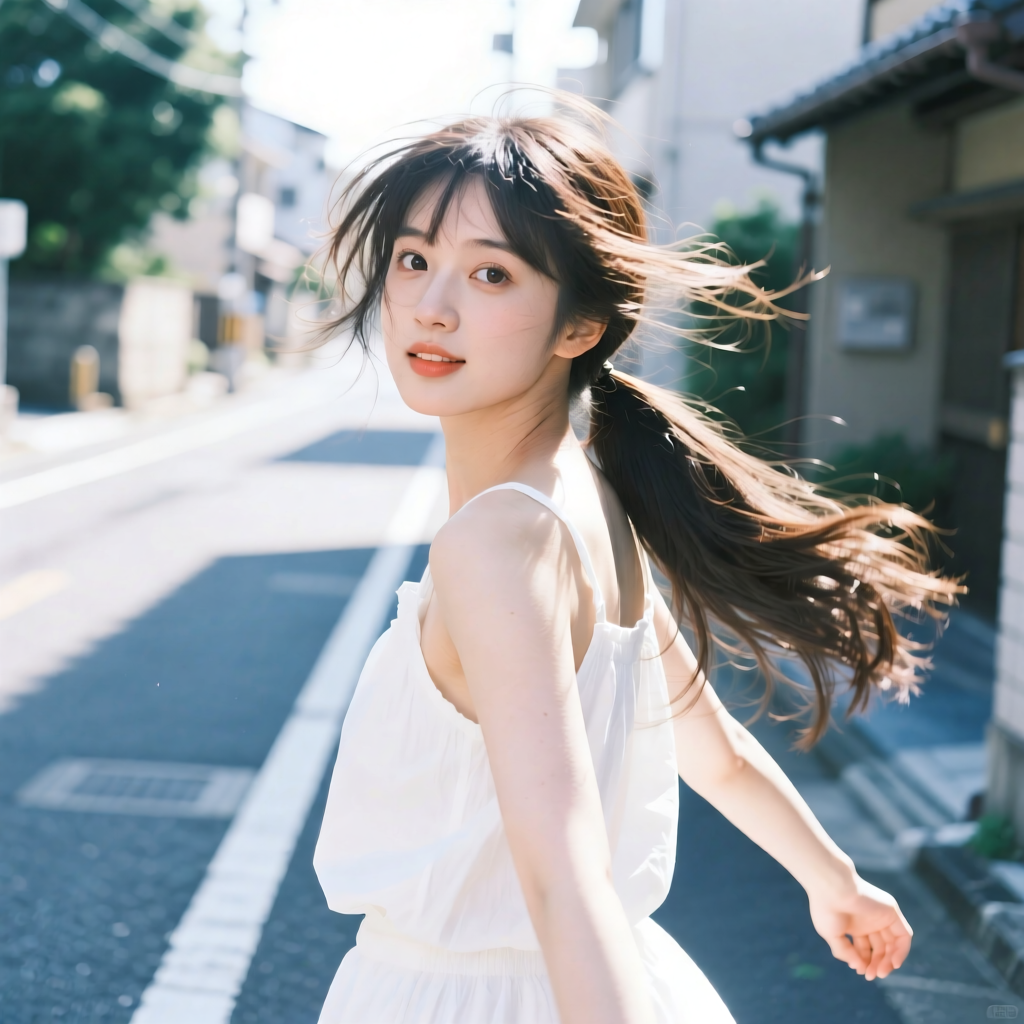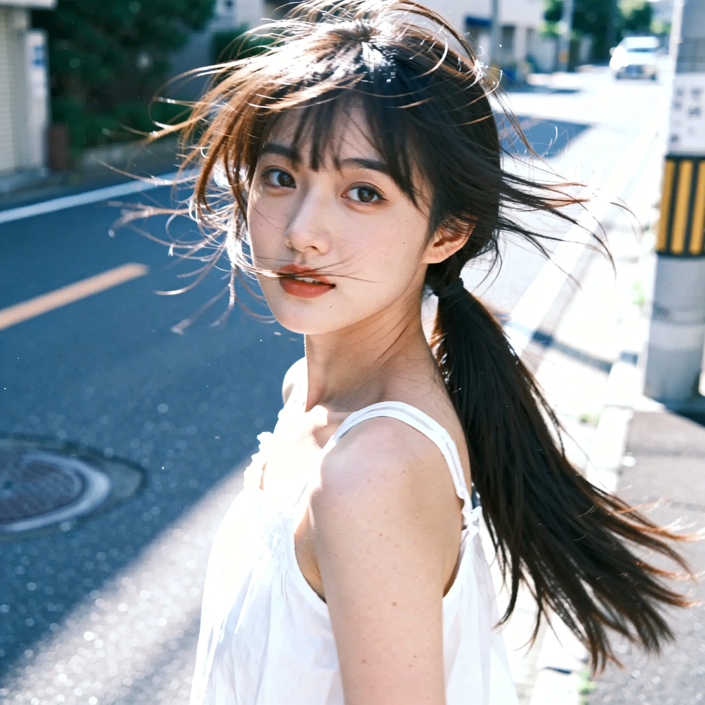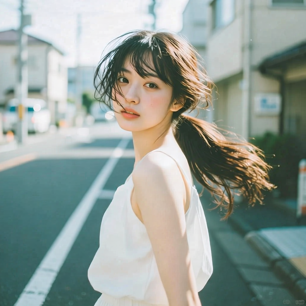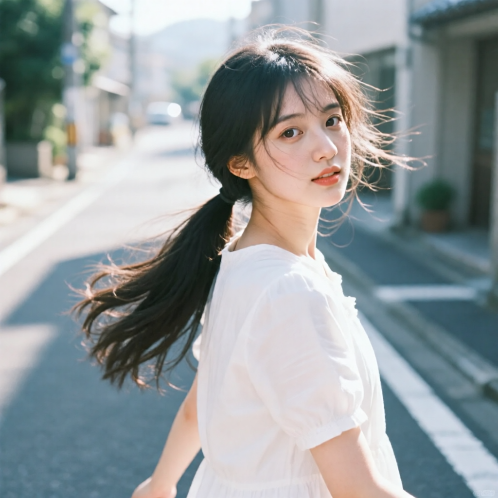 提示词:户外摄影,美女写真,夏天白色穿搭,长马尾,自然,微风,头发凌乱美,灵动转身,街道的路边,松弛感,近景,水平角度,眼睛特写,广角镜头,曝光过度,层次感,柔和侧光,光影对比,柔焦,胶片颗粒感,日系清新风,冷调,镜头美学,电影质感,高级感,大师级作品,