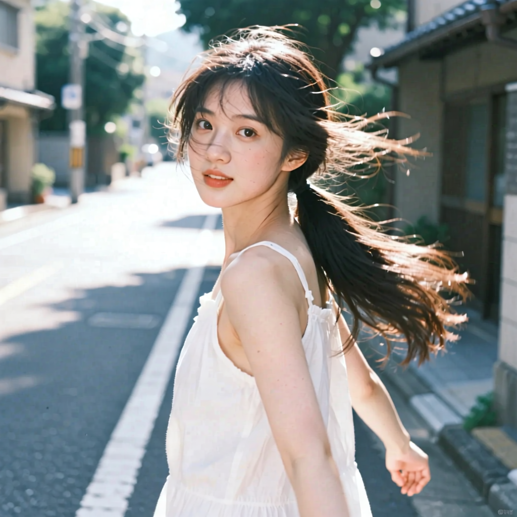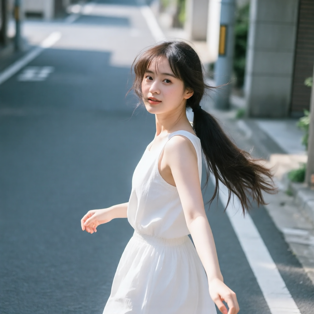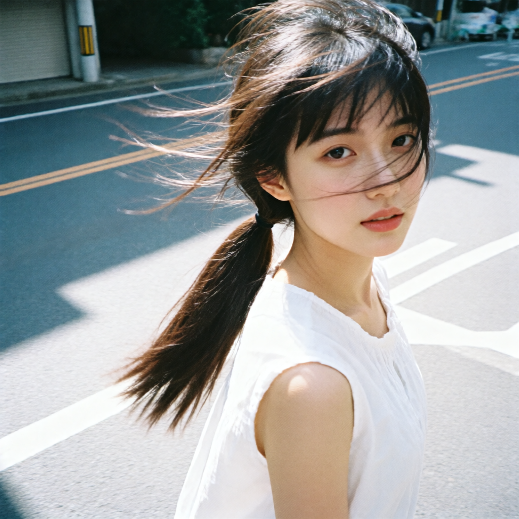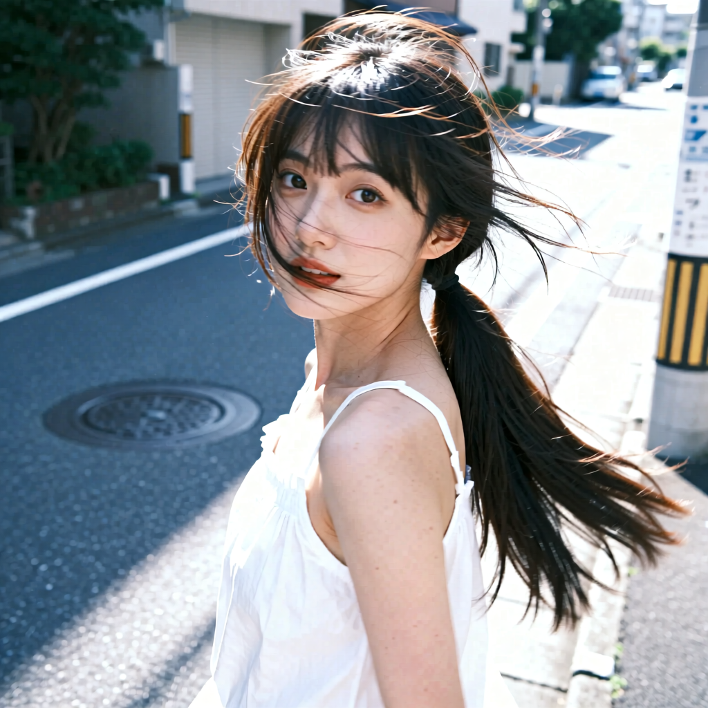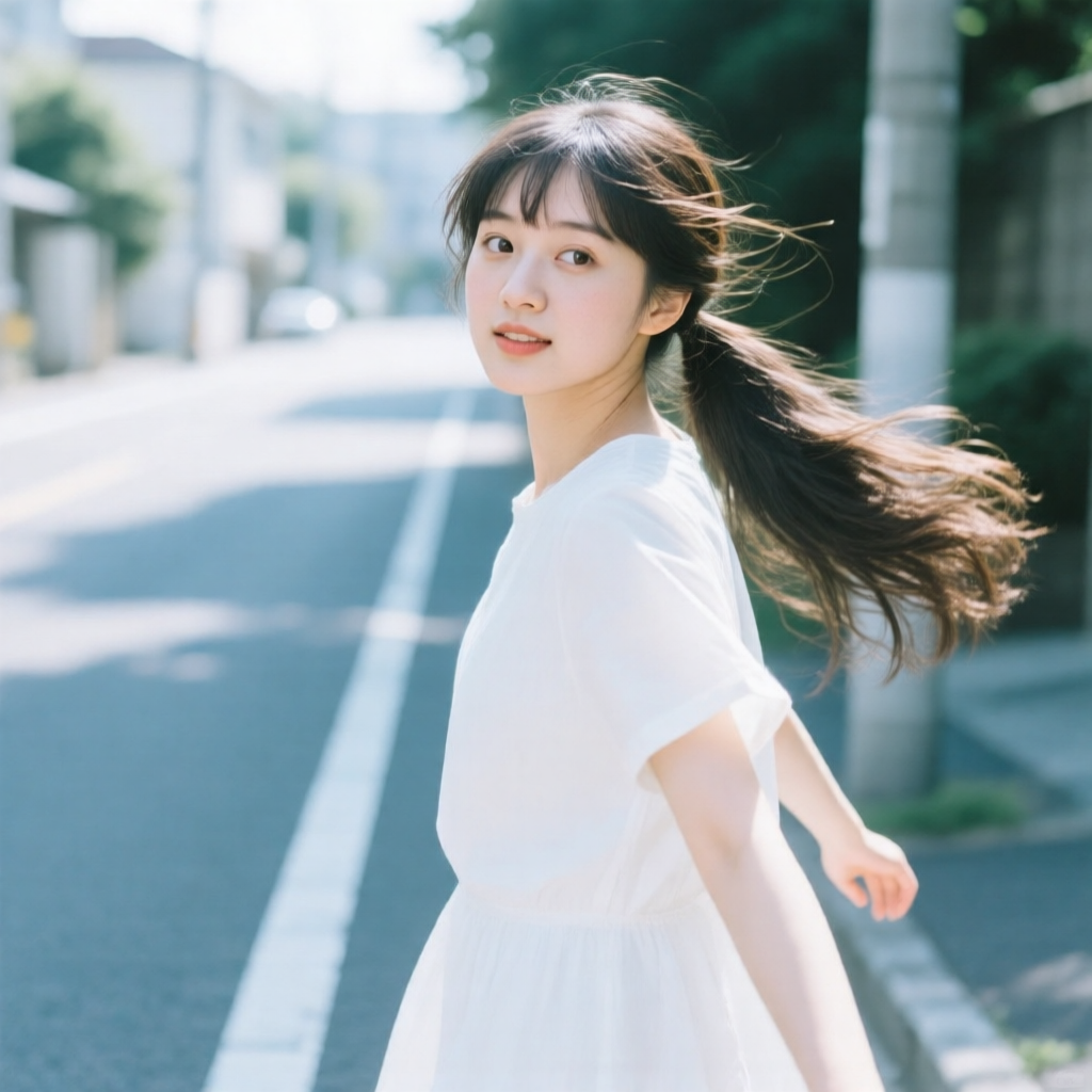 提示词:户外摄影,美女写真,夏天白色穿搭,长马尾,自然,微风,头发凌乱美,灵动转身,街道的路边,松弛感,近景,水平角度,眼睛特写,广角镜头,曝光过度,层次感,柔和侧光,光影对比,柔焦,胶片颗粒感,日系清新风,冷调,镜头美学,电影质感,高级感,大师级作品,