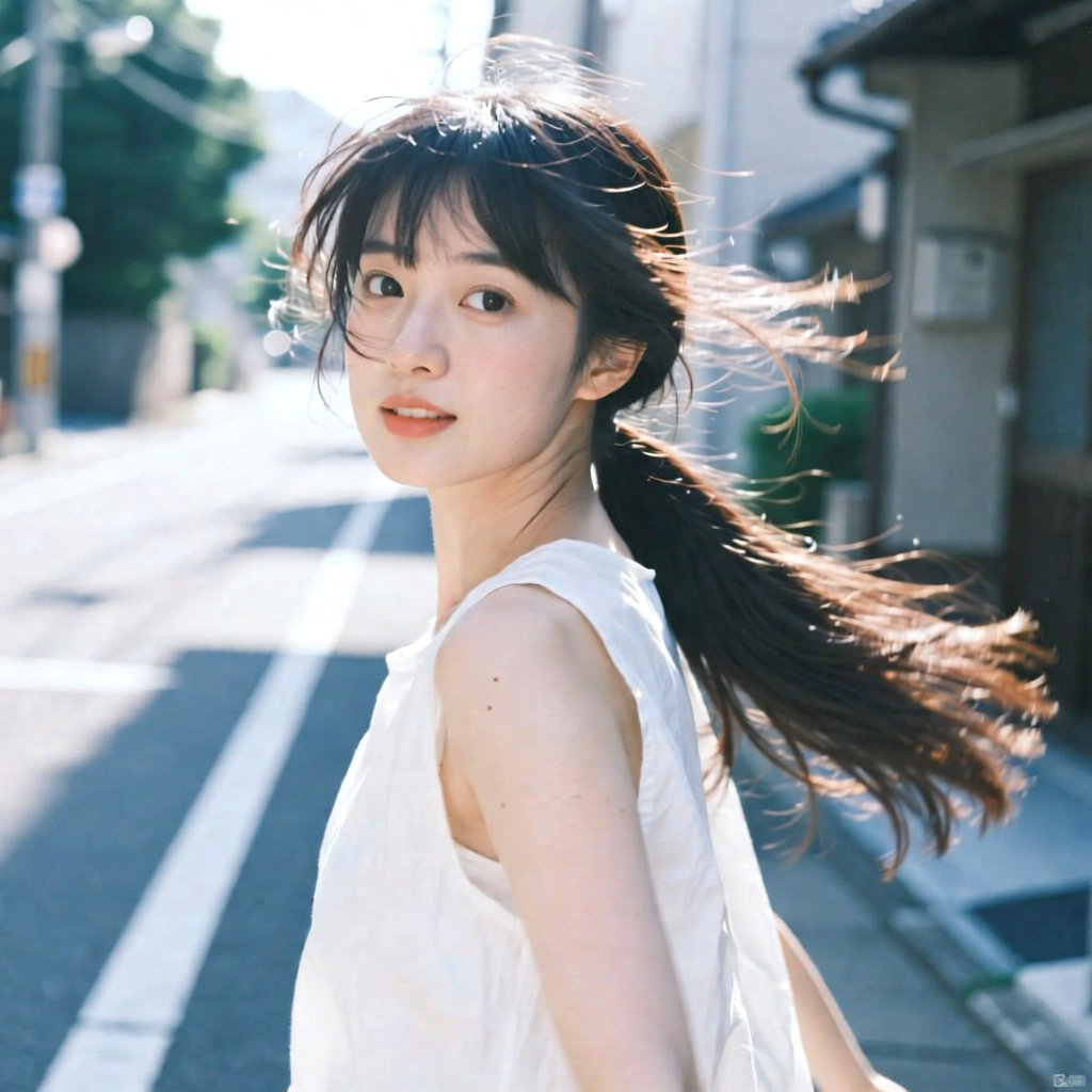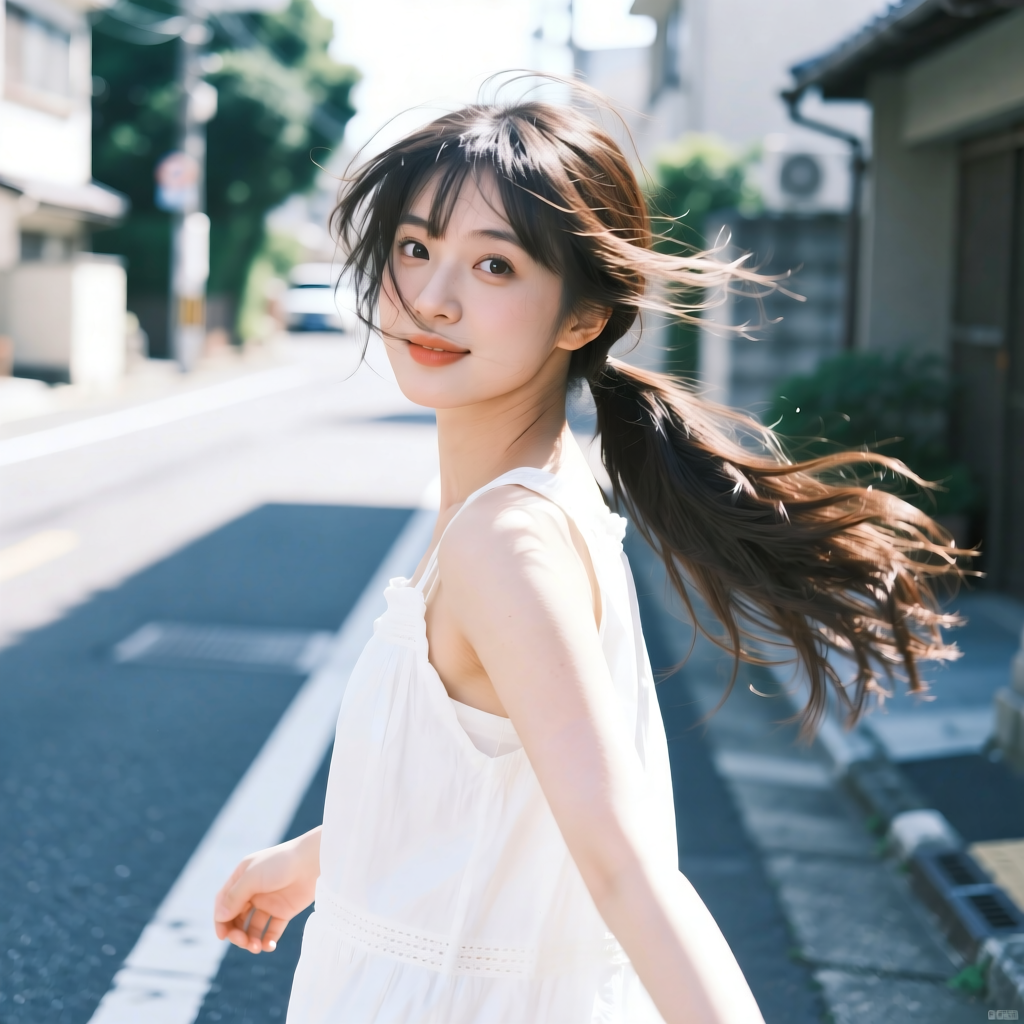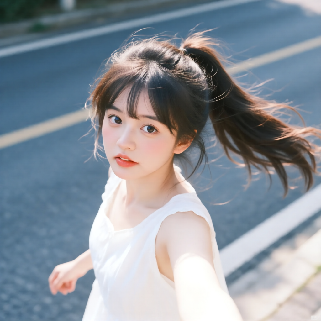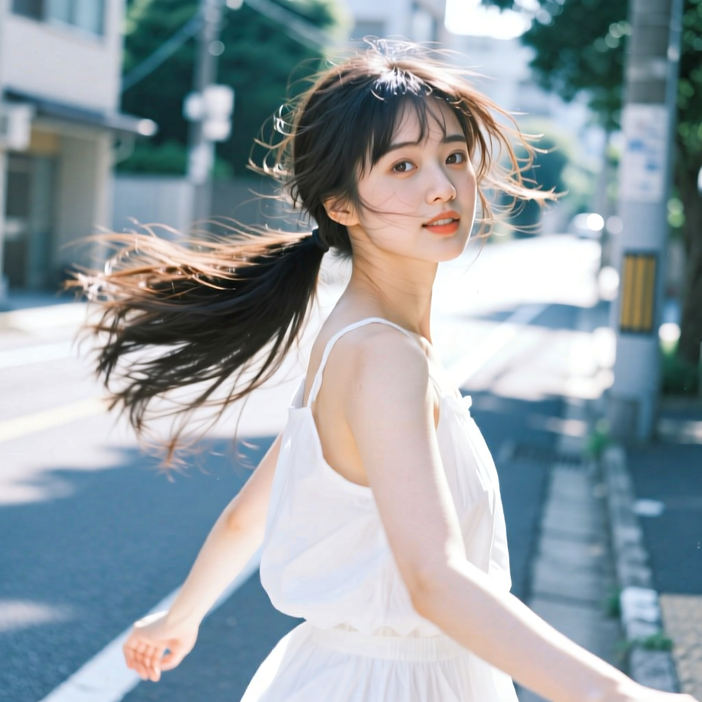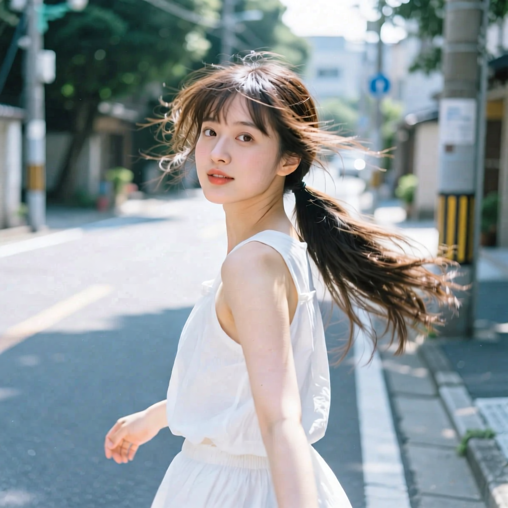 提示词:户外摄影,美女写真,夏天白色穿搭,长马尾,自然,微风,头发凌乱美,灵动转身,街道的路边,松弛感,近景,水平角度,眼睛特写,广角镜头,曝光过度,层次感,柔和侧光,光影对比,柔焦,胶片颗粒感,日系清新风,冷调,镜头美学,电影质感,高级感,大师级作品,